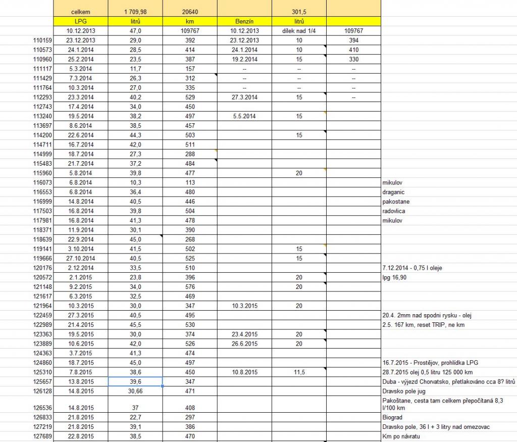 Leden 7, 20169 r Autor To vlákno jsem před dvěma lety zakládal já. Třeba ty údaje o tom, kdy a kde a u koho se LPG přepne někomu pomůžou. Jenom pro pořádek napíšu, že jsem teda nakmonec do toho šel a nelituju. Najedu v reálu více než jsem plánoval, ne sice o moc, cca 10 000 km/rok a přes uvedené (v původním dotazu) obavy jezdím levněji a letos by se měl plyn zaplatit. Nebýt spadených cen benzínu, už by to skoro bylo zaplacené. Při dnešních cenách je návratnost v případech jako můj ještě více delší. A tak se těším, že se benzín zase zdraží :-) Doplněno: přikládám "ukázku evidence" LPG a benzínu, bokem (tady to není vidět), mám ještě jednu tabulku, kde jsou udělané součty peněz a ušetřená částka ve více variantách s možností měnit cenu paliv :-). Dělám to v google docs a mám to kdykoliv po ruce. Upraveno Leden 7, 20169 r od panet